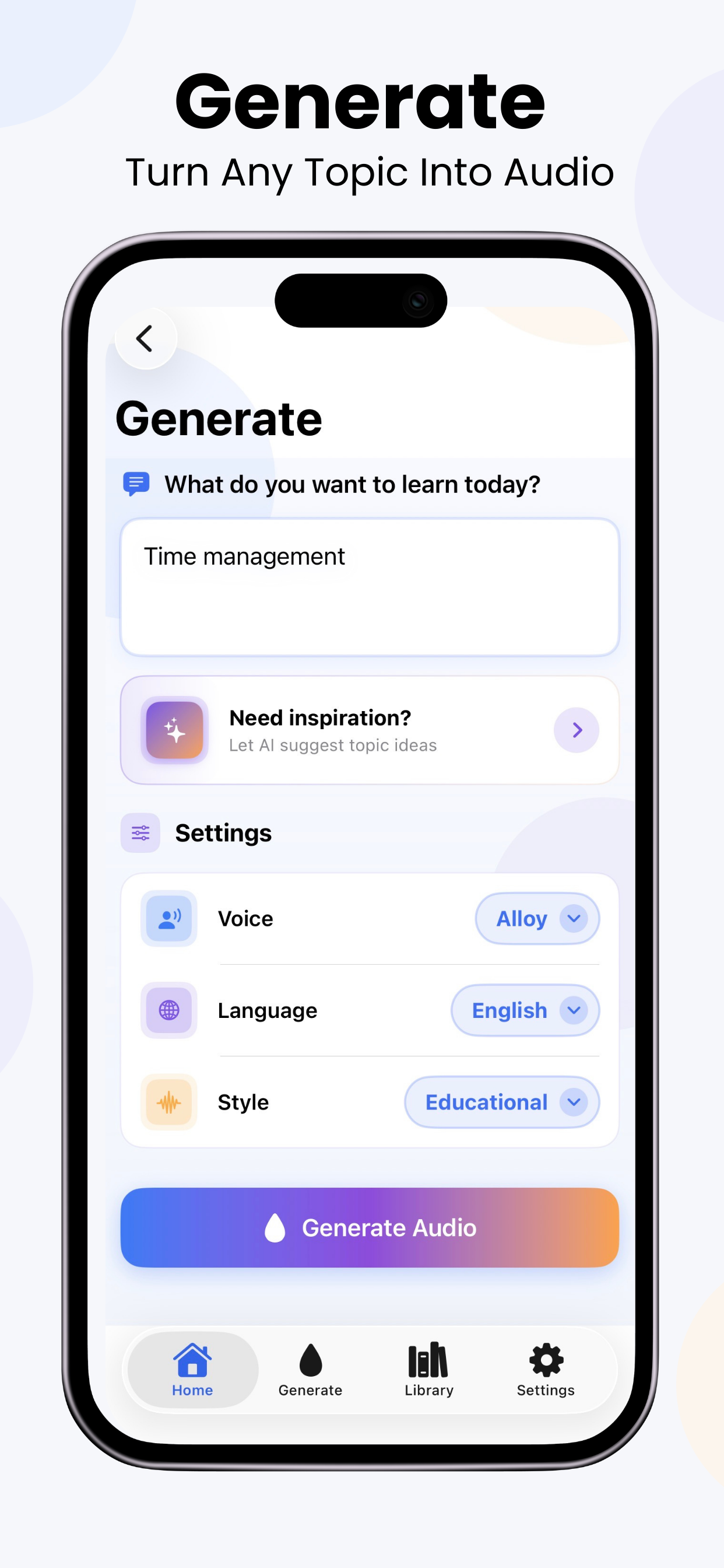 Learning shouldn't feel like work. MindDrops makes it effortless. Just type any topic. Get a professionally narrated audio lesson in seconds. Listen while you commute, exercise, cook, or relax. That's it. Effortless learning that fits your life.